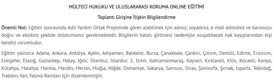 Önemli Not: Eğitim sonrasında Adli Yardım Ortak Projesinde görev alabilmek için adınız, soyadınız, e-mail adresiniz ve baronuzu doğru ve eksiksiz şekilde doldurmanız gerekmektedir. Bilgilerin hatalı girilmesi nedeniyle oluşabilecek hak kayıplarından kişi kendisi sorumludur.