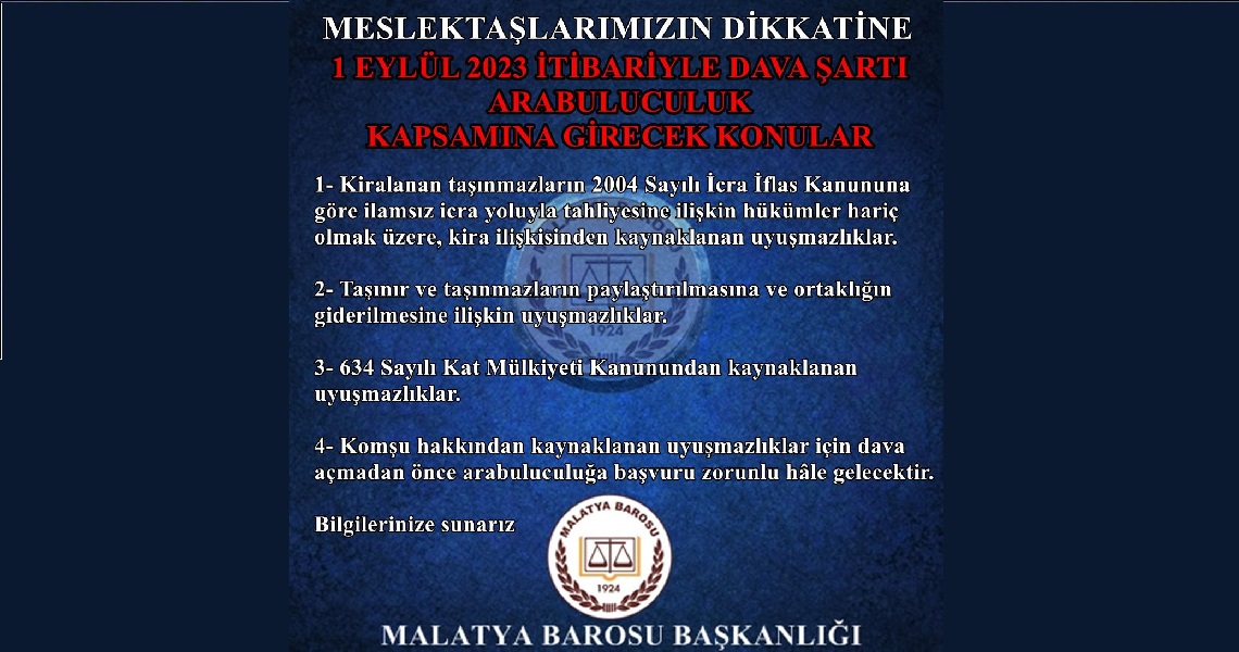 01 EYLÜL 2023 İTİBARİ İLE DAVA ŞARTI ARABULUCULUK KAPSAMINA GİREN KONULAR
