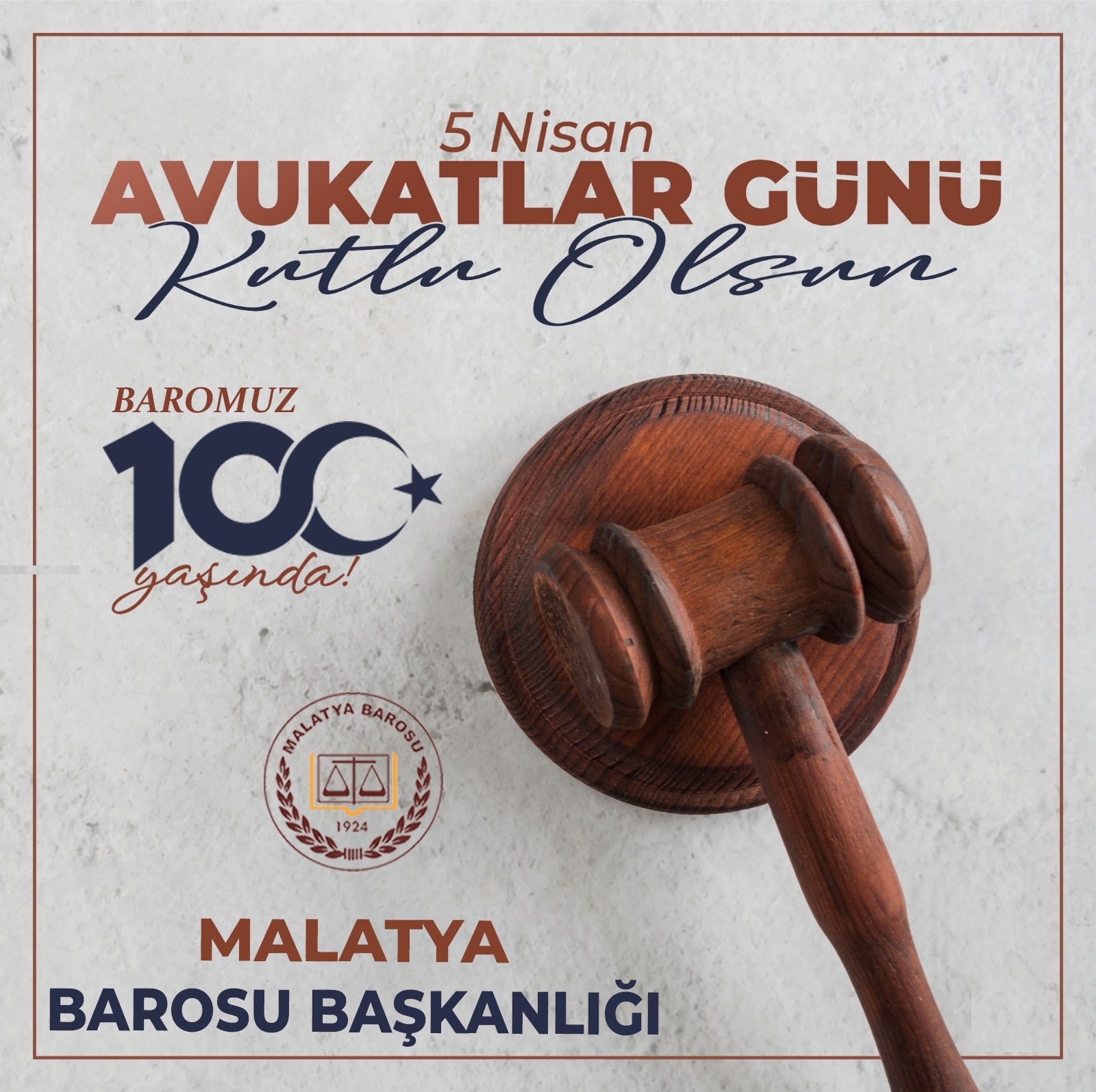 Bu Avukatlar gününün, Malatya Barosu’ nun kuruluşunun 100. Yılını doldurmuş olması vesilesi ile ayrı bir yeri olduğunu belirtmek isteriz. Mesleğimizin onur ve vakarının korunması, vatandaşlarımızın hak savunucusu olan avukatlarımızın mesleğini adil bir ortamda yürütebilmesi için mücadele edilmesi, mesleğe ve adalete yönelik tüm saldırılara göğüs gerilmesi, temel hak ve özgürlüklerin korunması noktasında kararlı olunması Baromuzun temel hedefi olup Malatya Barosu olarak 100. Yılımızı kutlamaktan şeref duyuyoruz.